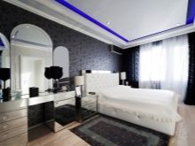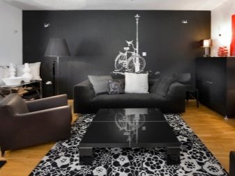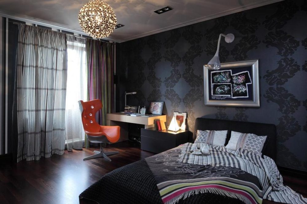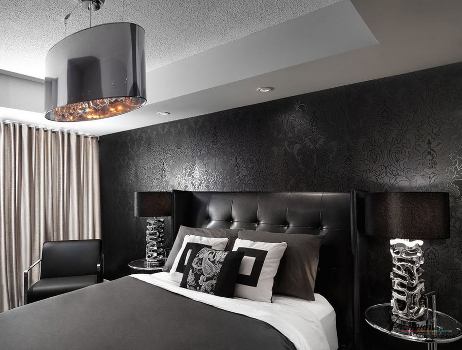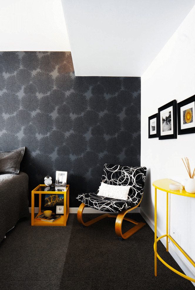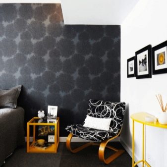 Zum Beispiel sehr beliebt kombinierte Optionen mehrerer Farben oder Texturen. Schwarz-Lila, Schwarz-Rosa, Schwarz-Gelb Kombinationen können nicht nur interessante helle Innenlösungen schaffen, sondern auch die Einzigartigkeit des Besitzers des Raumes unterstreichen.Es ist möglich, nicht nur monophone Varianten zu kombinieren, Räume, die ein einfarbiges Material mit einem Material kombinieren, das eine Zeichnung gut aussehen lässt.