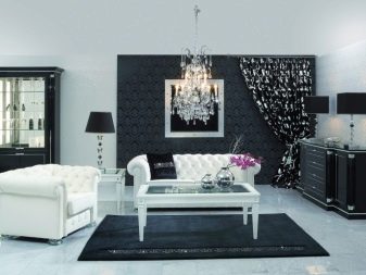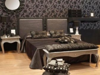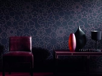 Dunkle Tapeten können mit kontrastierenden Accessoires kombiniert werden, sie können mit Silber oder Vergoldung versehen werden, solche Optionen passen am besten in den klassischen oder modernen Stil. Um das Innere zu dunkel zu verdünnen, können Sie die richtige Möbelauswahl verwenden. Hellere kontrastierende Farben "entladen" den Raum und fügen Licht hinzu.