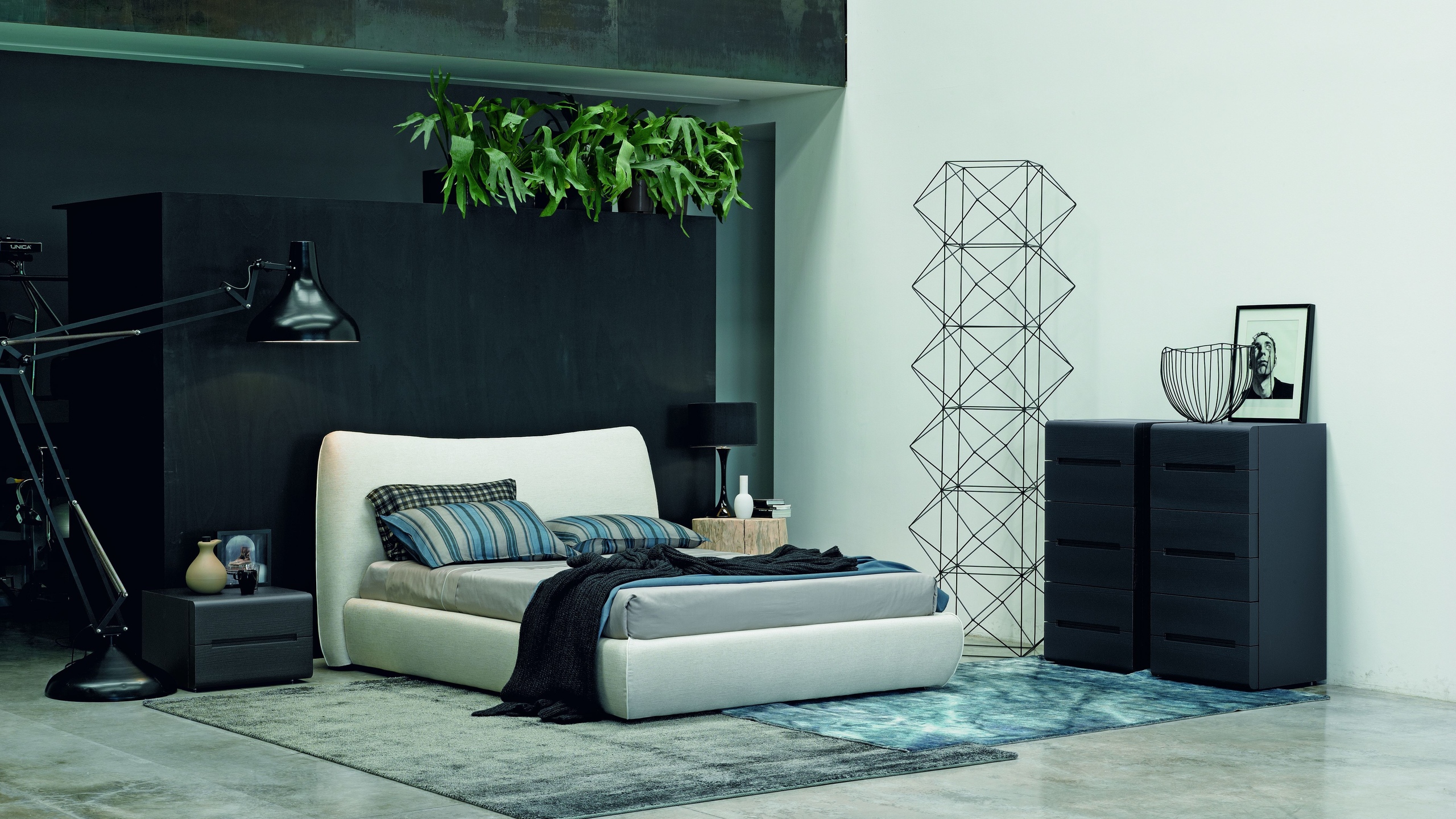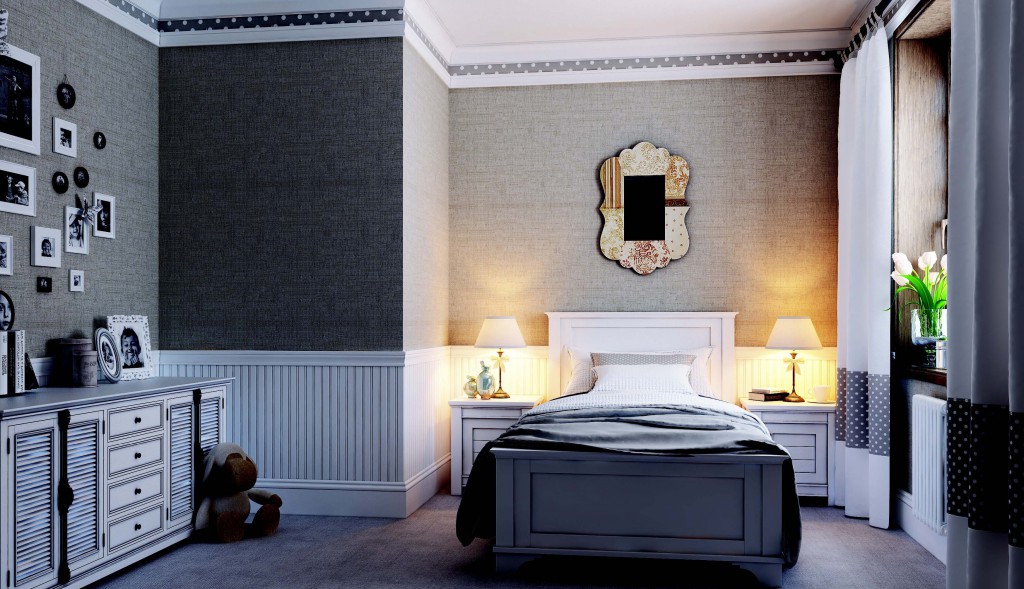 In dem als Schlafzimmer genutzten Raum können Sie auch dunkle Wände verwenden, um die Wände zu kleben. Um die Düsternis des Innenraums zu verdünnen, können Sie verschiedene Muster oder einen hellen Deckensockel verwenden.