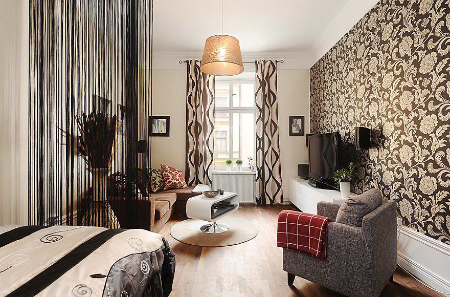Als Dekor im Schlafzimmer und Wohnzimmer sowie im langen Flur sehen dunkle Tapeten toll aus, sie bringen Abwechslung und Lebensfreude ins Interieur.