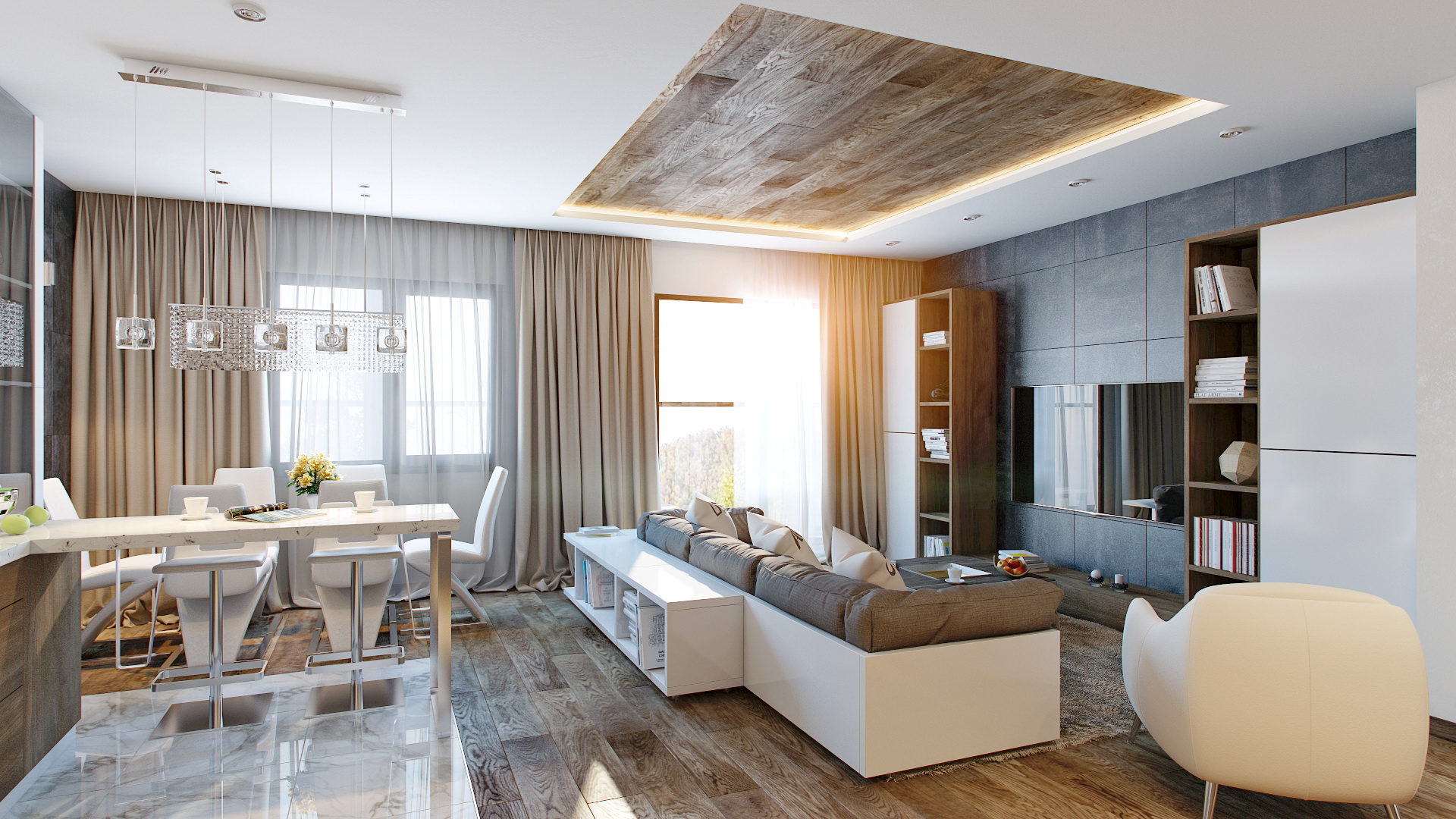 Außerdem können Sie den Raum dehnen, wenn Sie eine dunkle Leinwand an den kurzen Wänden des Raums platzieren.