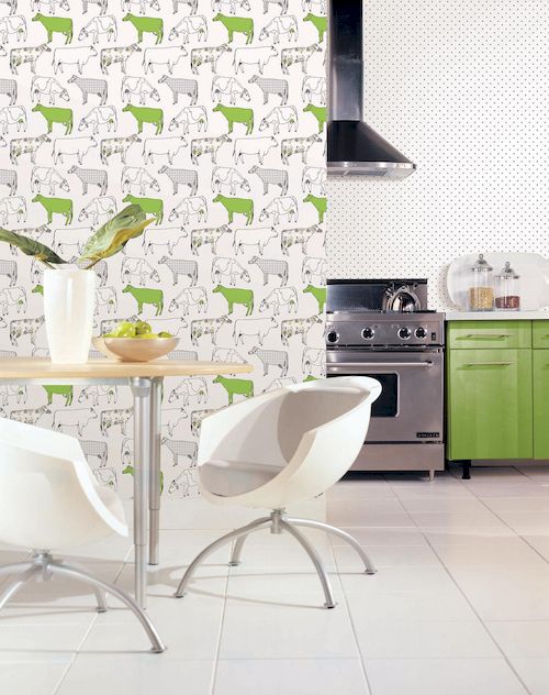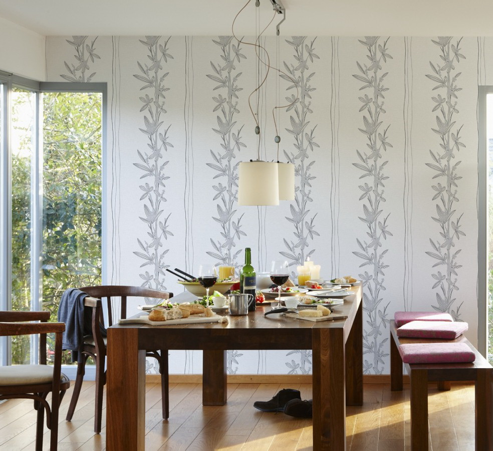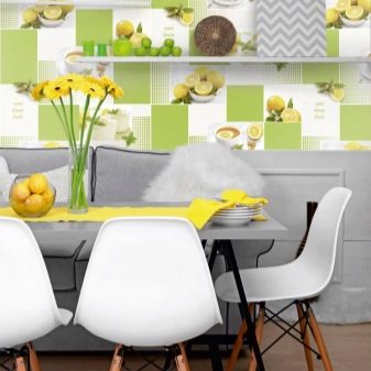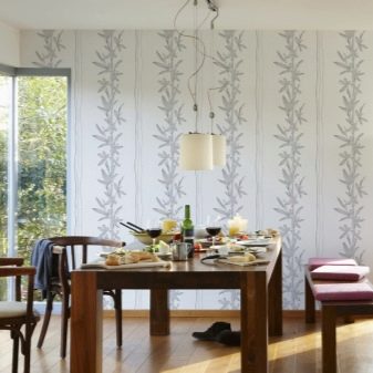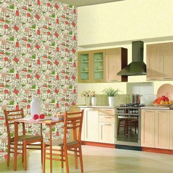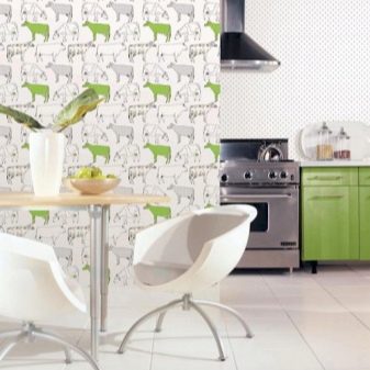 In der Küche wird sehr beliebt waschbare Tapete sein. Kitchen Vinyl hat keine große Auswahl an Farben, aber es ist möglich, etwas passendes auszuwählen.Ja, und andere Beschichtungsarten werden hier verwendet. Eklektische Ornamente, geometrische Muster und Streifen in hellen Farben unterstreichen den Essbereich und lassen die Gäste nicht gleichgültig.