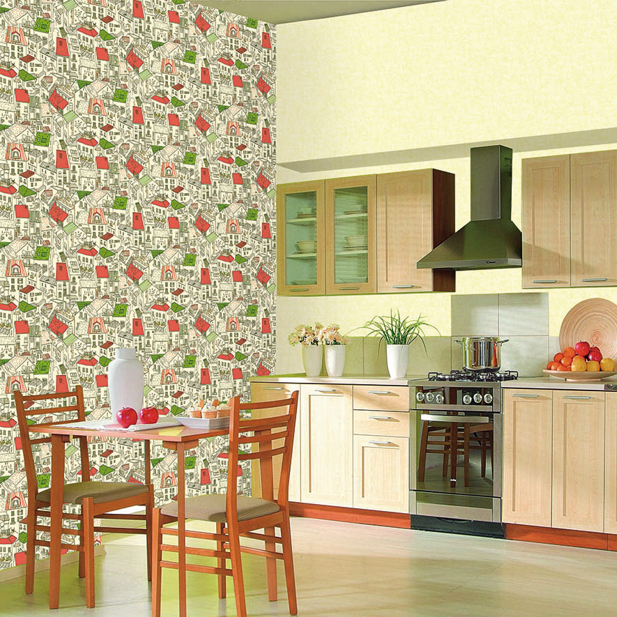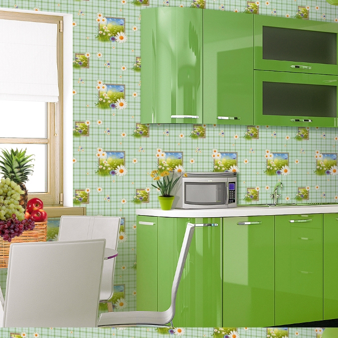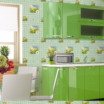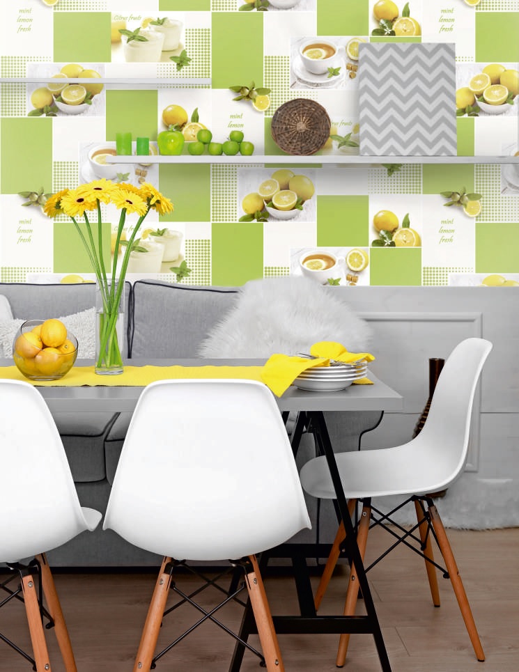 - Das Küchenvinyl besitzt die dichte gummierte Schicht. Es ist in der Lage, Keramikfliesen zu ersetzen, wäscht und ist resistent gegen Feuchtigkeit.