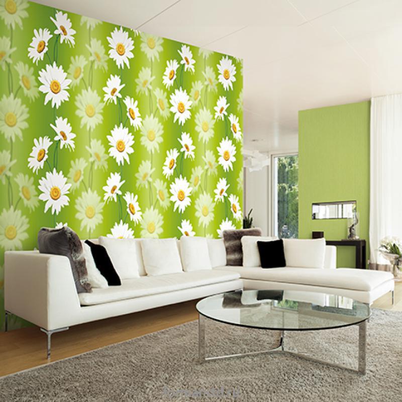 Eine ausgezeichnete Option für ein Wohnzimmer in beruhigenden Farben - mit großen Blumen getrimmt.