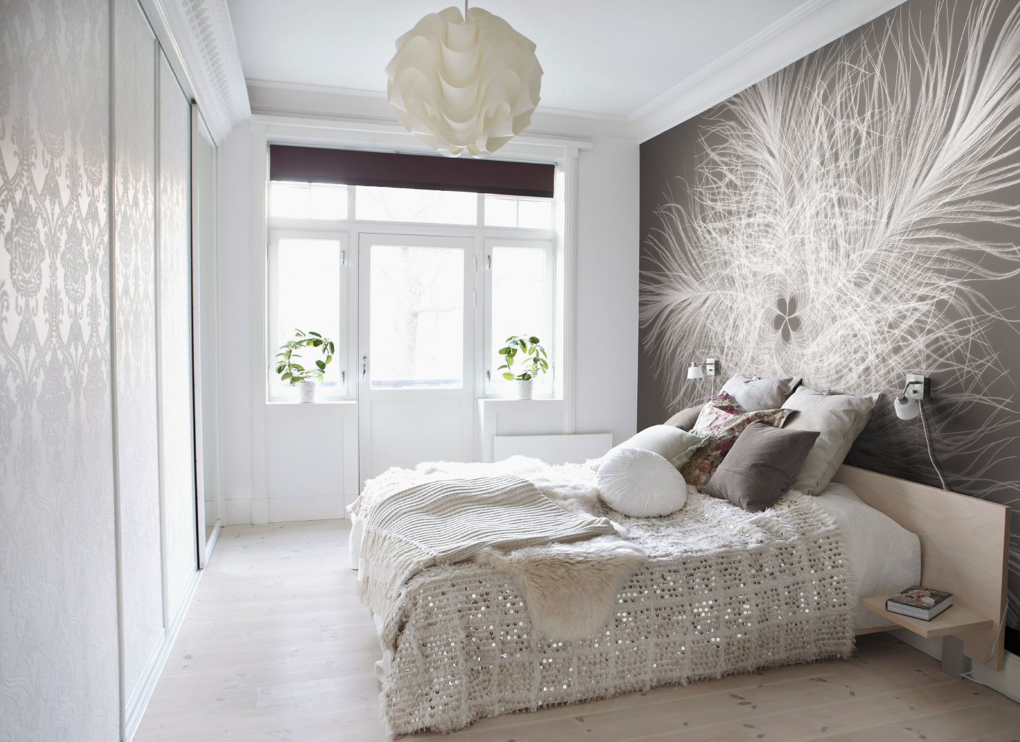 Auch im Schlafzimmer ist es besser, atmungsaktiven Tapeten den Vorzug zu geben. Obwohl die Wand mit Vinyl-Beschichtung dekoriert wird, wird dem Raum ein einzigartiges Design verliehen. Pastell-Siebdruck wird niemanden gleichgültig lassen, und bei richtiger Belüftung des Raumes kann das Problem der Umweltfreundlichkeit von Vinyltapeten als irrelevant betrachtet werden.