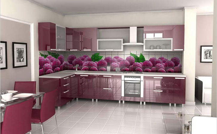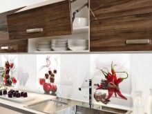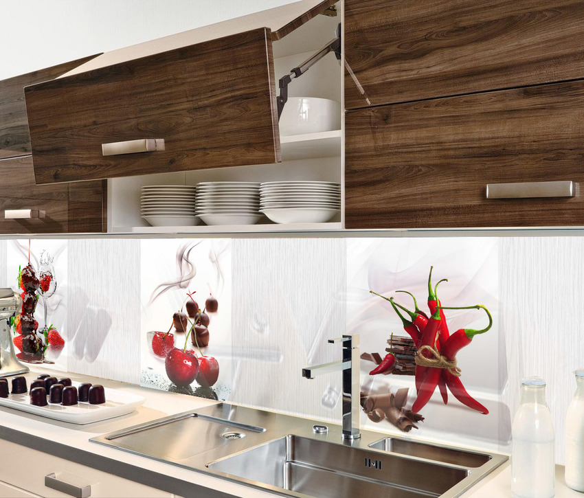 Zeichnung für die Küchenplatte, können Sie große, für die Farbgebung und Thema der Gesamtgestaltung des Raumes geeignet wählen. Es kann Makro-Bilder von reifen Beeren, Blütenknospen, helle abstrakte Formen sein.