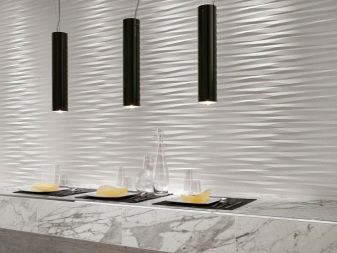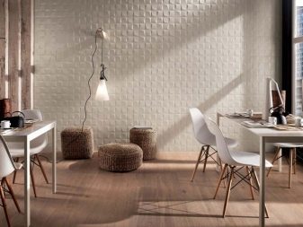 Je nach Textur können 3D-Reliefkacheln unterschiedlichste Ornamente aufweisen: konvexe abstrakte Hemisphären, Waben, wellenartige Spielsteine, florale Ornamente. Die Auswahl an geprägten Keramiken nimmt aufgrund verschiedener Strukturoptionen ebenfalls zu. Es kann rauh sein, glänzend oder matt.