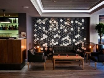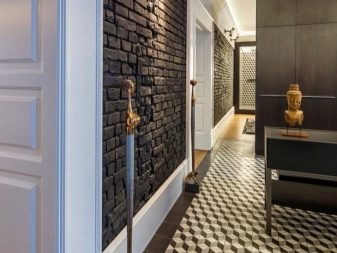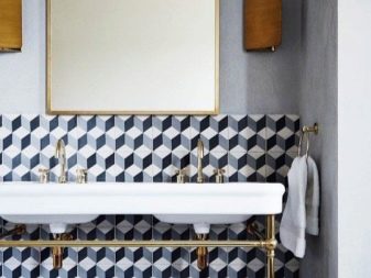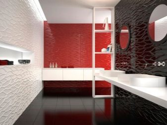 Die großzügigen Auskragungen aus Reliefkeramik oder Keramikfliesen mit einem Muster, das mehrdimensionale Textur erzeugt, zum Beispiel die visuelle Wahrnehmung eines konvexen Ziegelsteines, eines Schachbretts, psychedelischer Muster, werden in geräumigen Hallen oder Badezimmern gut aussehen. Aber Sie sollten nicht den ganzen Raum mit solchen gesättigten Materialien ausbreiten, da Sie sich auf so engem Raum bis zum Schwindel leicht "verirren" können.