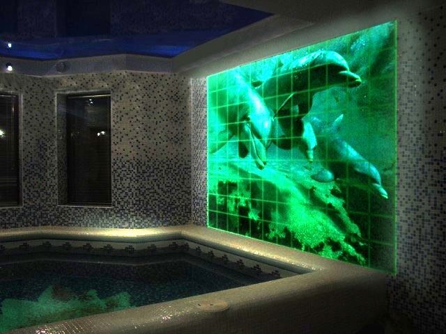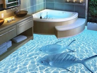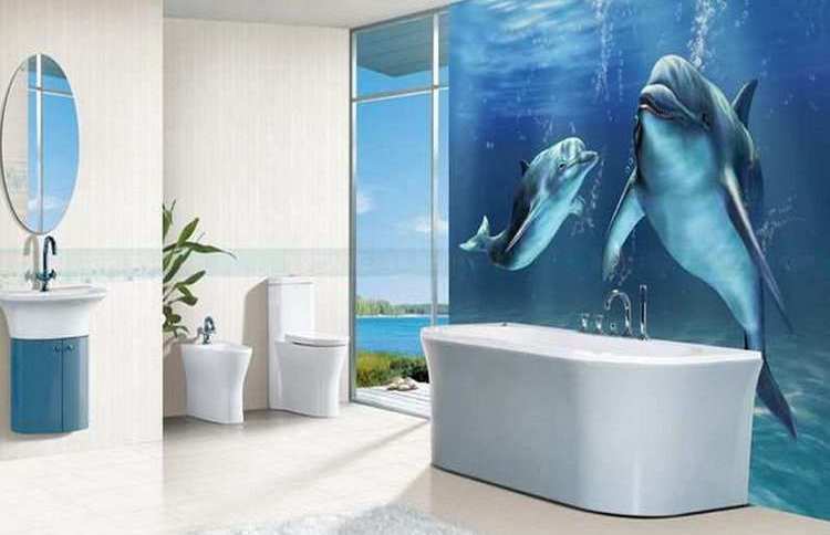 Meistens wird 3D-Beschichtung für die Verkleidung von Wänden und Böden in Badezimmern, Küchen und Pools verwendet. Dies erklärt die Fülle von Meeres- und Wasserthemen in den meistverkauften Fliesenoptionen. Und in der Tat sind die wiederbelebten Gemälde von Korallenriffen, plätschernden Delfinen oder einem Bach, der am Grund der Flusskieseln entlangfließt, eine wunderbare Dekoration für Räume, die mit Wasser verbunden sind.