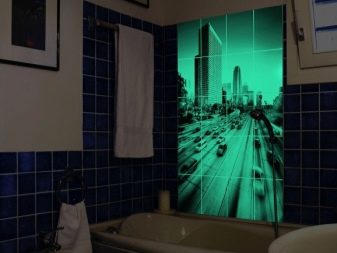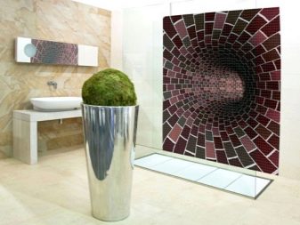- 3D-Zeichnung. Die dünnsten transparenten Platten brechen das einfallende Licht, ein Film mit einem Muster liegt zwischen ihnen, und die Fliesenoberfläche wird durch dauerhaftes transparentes Polycarbonat vor mechanischen Einflüssen geschützt. 3D-Zeichnung ermöglicht es Ihnen, den Raum mit Blick auf die Natur, Fotografien von Straßen in der Perspektive, geometrische volumetrische Figuren zu dekorieren. Der Fantasie von Autoren und Designern sind keine Grenzen gesetzt.
