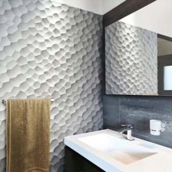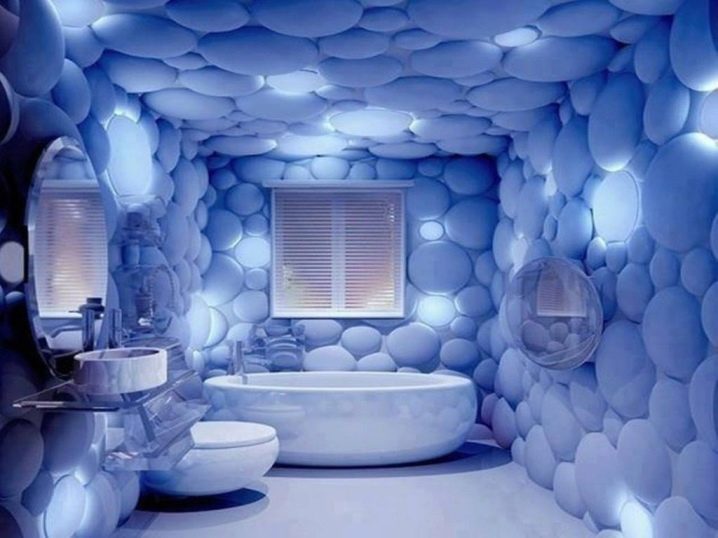 Für Liebhaber futuristischer Abstraktionen eignen sich geprägte konvexe Fliesen in sanften Farben. Ein komplett mit diesem Material ausgekleidetes Badezimmer schafft ein Gefühl von Blasen und sieht sehr originell aus.