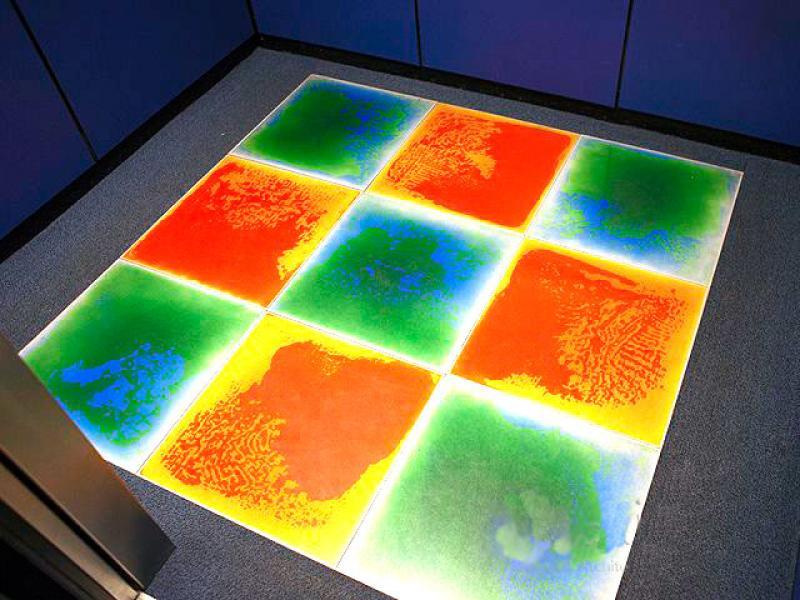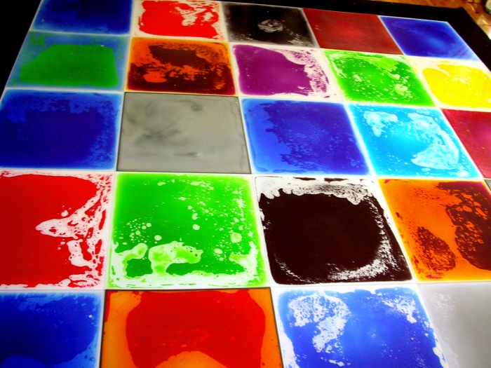 - Gel. Zusätzlich zum Zeichnen oder Fotos wird flüssiges mehrfarbiges Gel verwendet, um die Fliese zu füllen. Wenn Druck auf die Oberfläche ausgeübt wird, wird das Gel unter der transparenten Beschichtung verteilt, wobei jedes Mal ein neues einzigartiges Muster erzeugt wird.