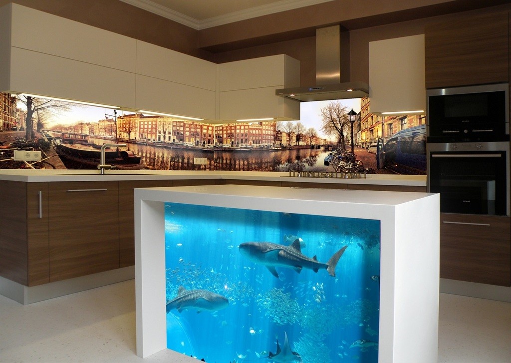 Ein atemberaubender Blick auf die Küche kann mit 3D-Bildern von Delfinen, Fischen, Korallen und Seesterne erstellt werden.Die Küchenschürze wird die Form eines im Dunkeln leuchtenden Aquariums haben und den Küchenraum deutlich beleben. Nachtlichter sind sparsam und dienen als bezauberndes Nachtlicht.