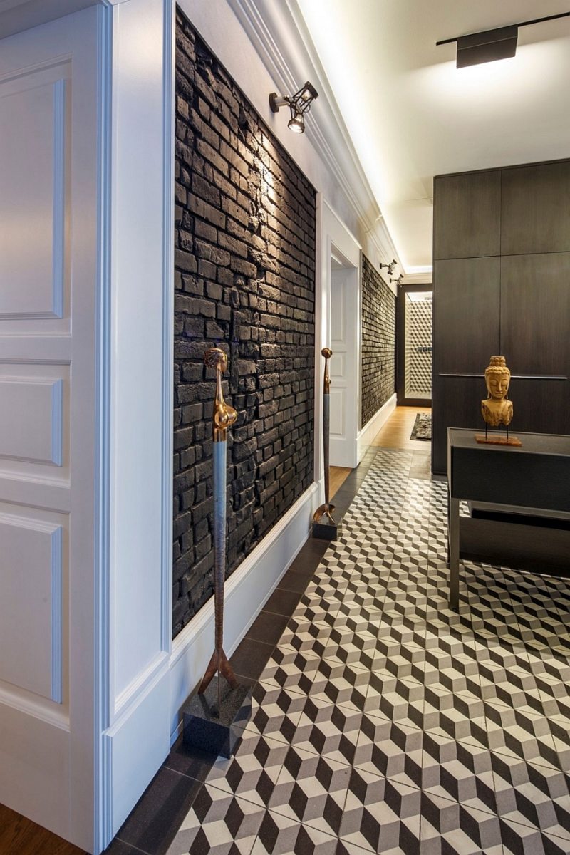 Weiß und Schwarz 3D-Fliesen werden perfekt in einem klassischen Interieur und Art-Deco-Stil aussehen. Warme Holztöne werden sowohl strengen Klassikern als auch Öko- und Landhausstilen gerecht.