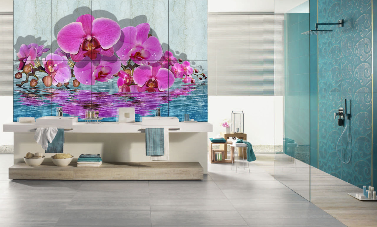 Ein anderer Weg - UV-Druck, dh Trocknen der Farbe direkt auf dem Material unter der Einwirkung von UV-Strahlung. Diese Technologie ist moderner und ermöglicht Ihnen die auffälligsten Ergebnisse und eine lange Lebensdauer. 3D-Keramik unterscheidet sich von den üblichen gemusterten Fliesen.