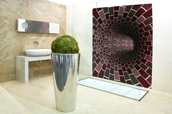 Aus dem Vorhergehenden ist ersichtlich, dass die Verwendung von 3D-Kacheln auf ihren visuellen Merkmalen beruhen sollte, dh auf der Oberfläche, auf der sie sich "enthüllen" kann. Gel-Muster eignen sich für Bodenbeläge und horizontale Oberflächen - Arbeitsplatten, Bartheken. "Live" -Zeichnungen sehen sowohl auf dem Boden als auch an der Decke und an den Wänden gut aus.