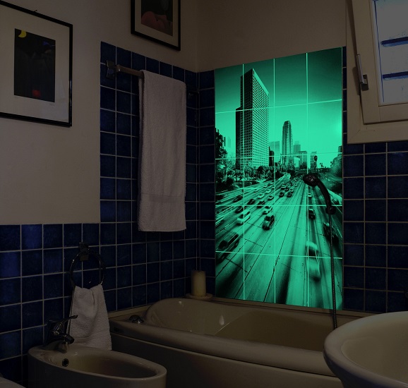 - Phosphor. Eine andere Möglichkeit, das ursprüngliche 3D-Dekor zu verwenden, besteht darin, einen Leuchtstoff in der Vertiefung einer Fliese zu verwenden - im Dunkeln leuchten. Dieser Effekt beruht auf der Fähigkeit von Partikeln, Ladung von Tageslicht oder künstlichem Licht zu akkumulieren.