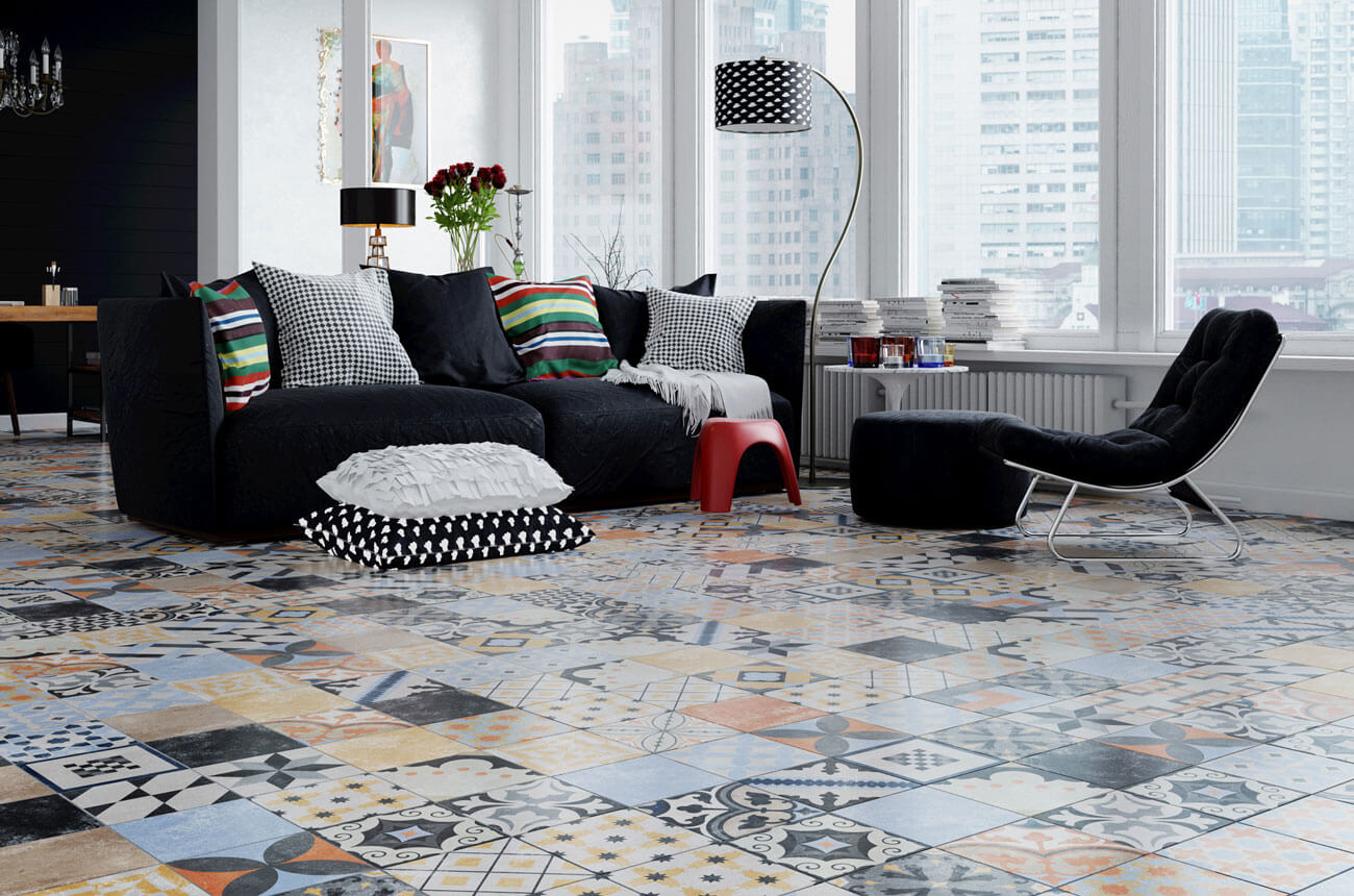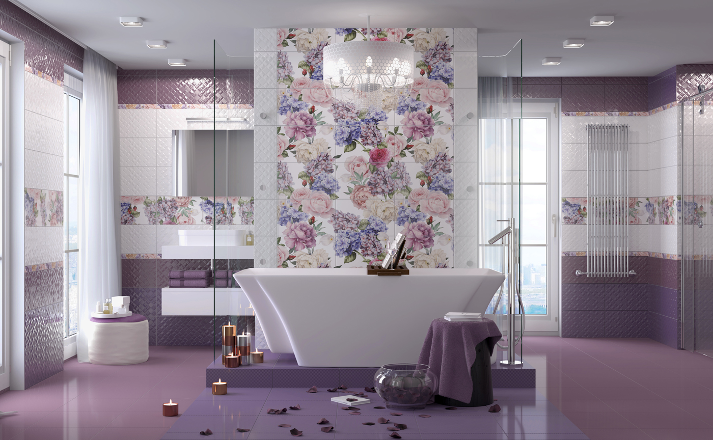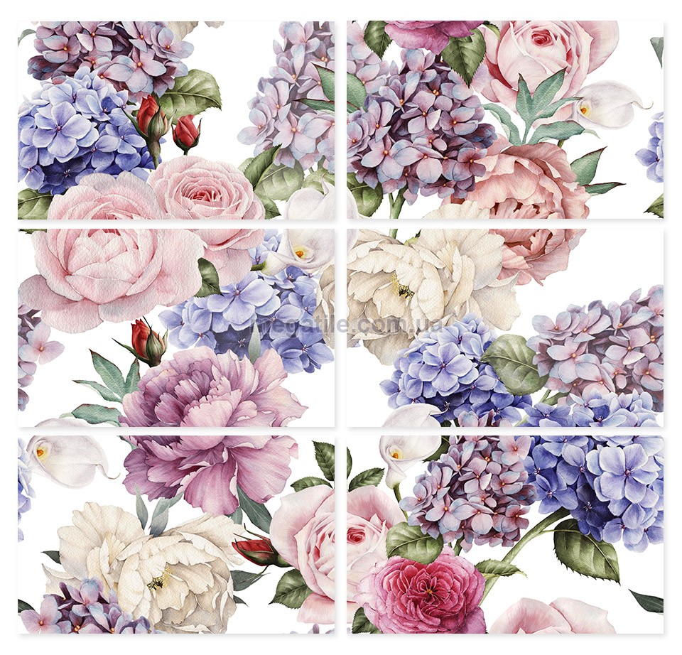 - Gortenzia - eine Reihe von Keramikfliesen mit bunten Drucken. Die Farben dieser Kollektion werden Ihre Stimmung heben und eine gewisse Fröhlichkeit auslösen.