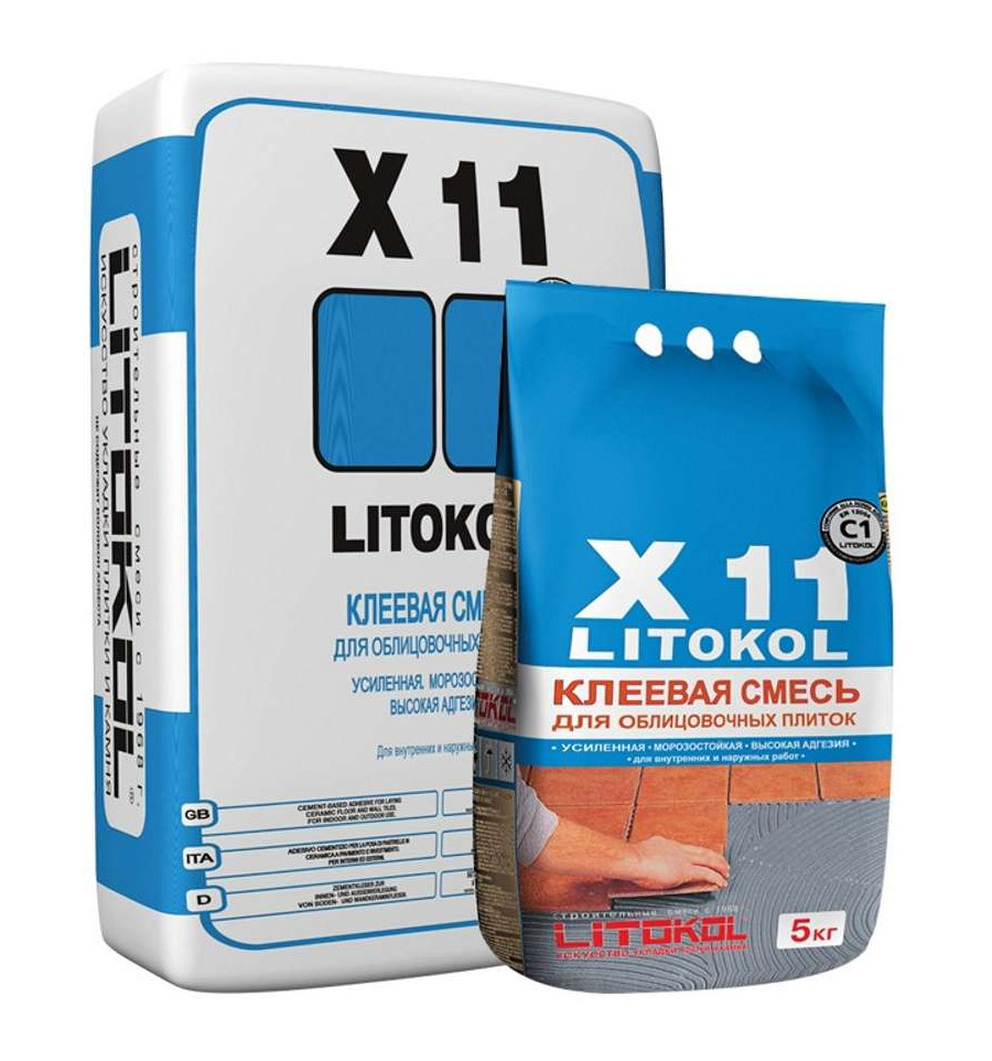 - Sie können auch kaufen Litokol X11. Die Mischung enthält Portlandzement sowie Sand in Form von Granulaten. Geeignet zum Kleben großer Fliesen.