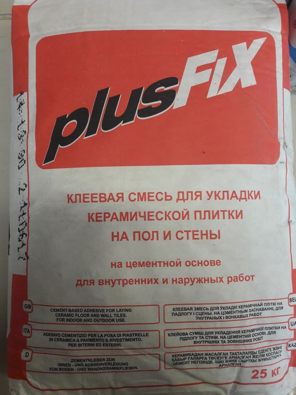 - Plusfix. Pulverförmige Mischung auf der Basis von Zement und Sand aus Quarz. Enthält auch Zellstoff. Plusfix wird zum Kleben von kleinen Fliesen (maximale Abmessungen - 25x25 Zentimeter) verwendet. Die Grundlage für das Verlegen von Fliesen auf solchen Leim kann als eine Oberfläche aus Zement, Beton und Ziegel dienen.