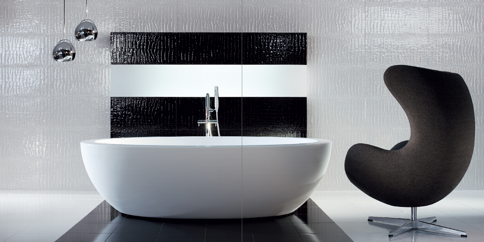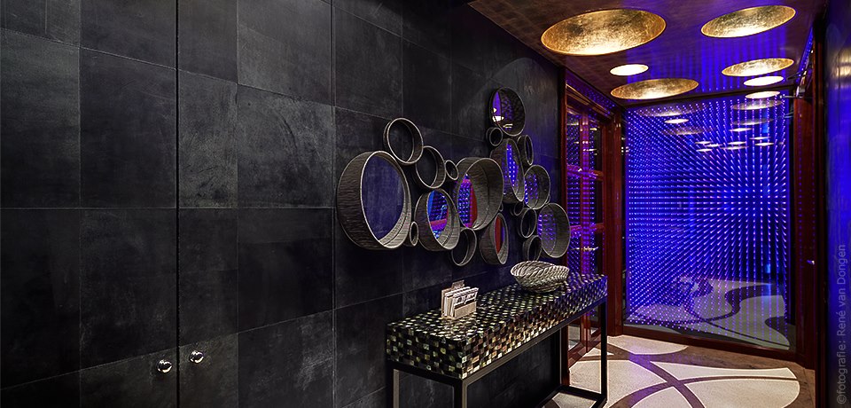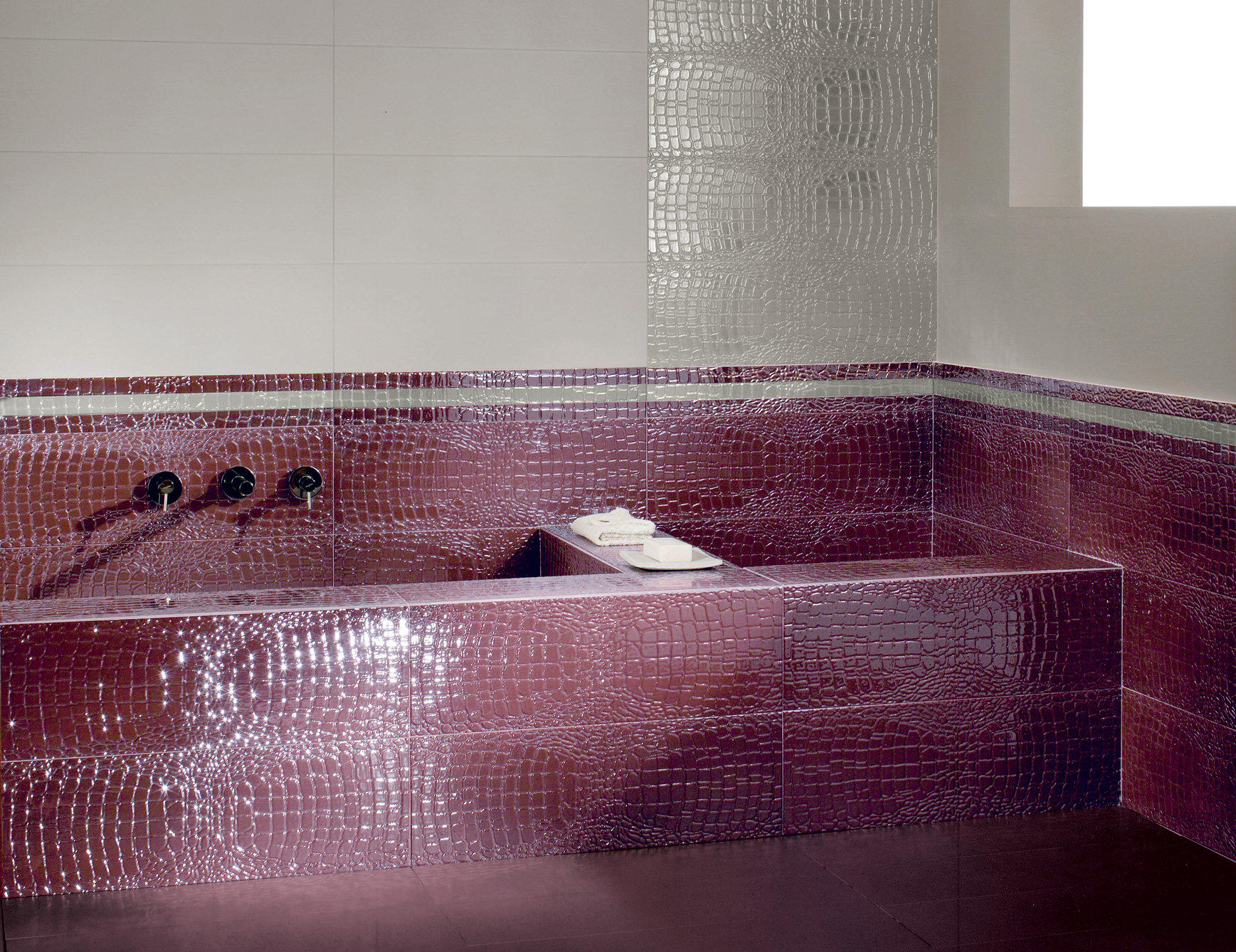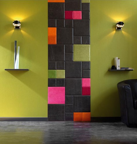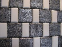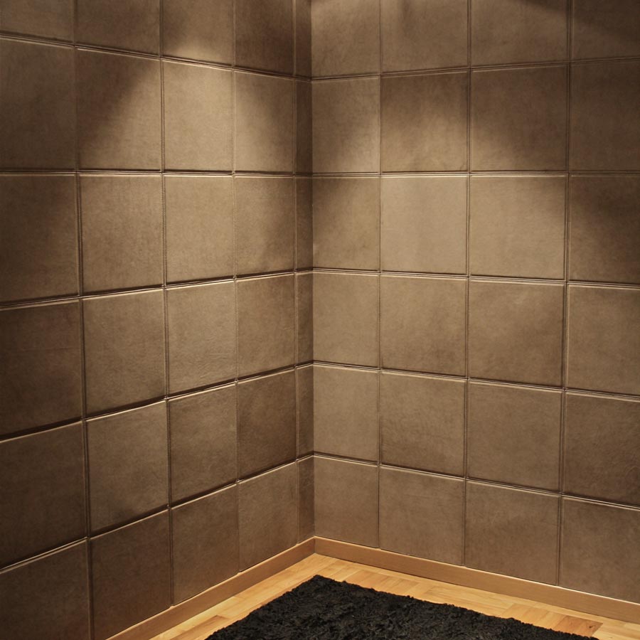 Volume Keramikfliesen mit Leder bezogen.