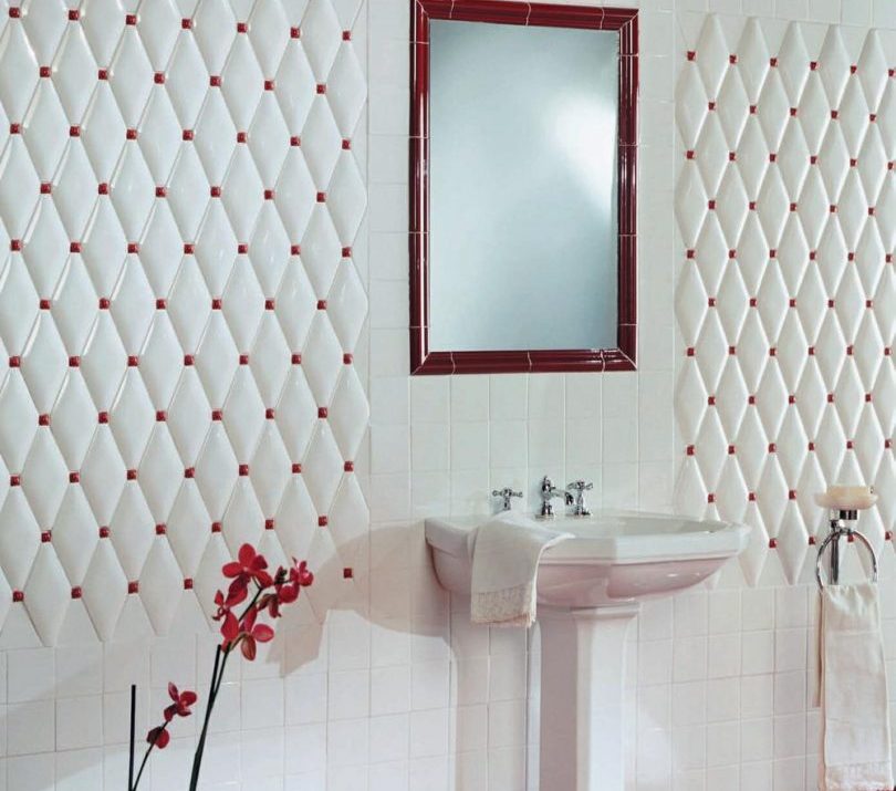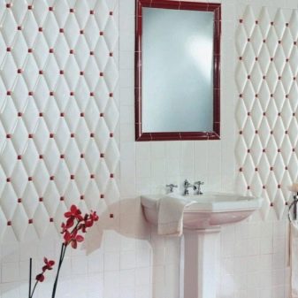 Keramische Beschichtung mit Imitation von gestepptem Leder wird sowohl Wohn- als auch Büroräume schmücken. Solches Material ist resistent gegen Feuchtigkeit, was es ermöglicht, es für das Badezimmer zu verwenden.