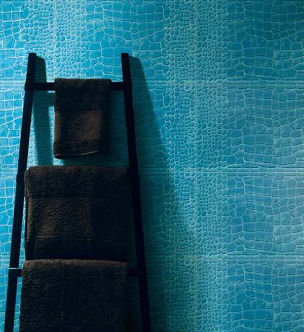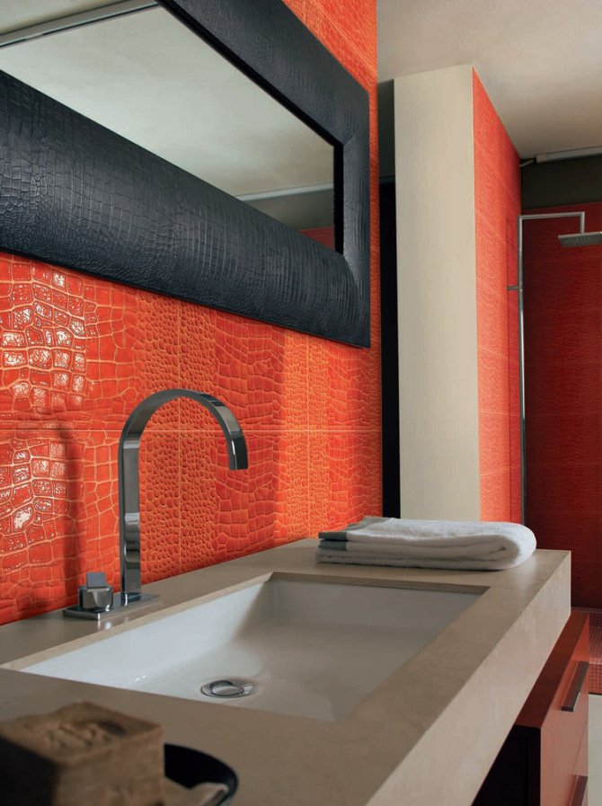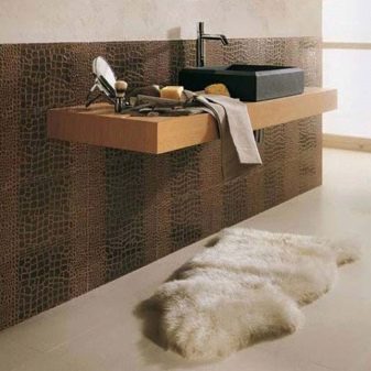 Keramikfliesen mit einer strukturierten Oberfläche unter der Haut werden nicht so beeindruckend aussehen wie Modelle aus natürlichem Material. Eine solche Beschichtung ist jedoch viel billiger als Lederplatten.