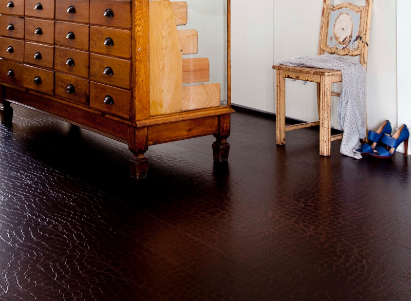 Zwei-Schicht-Modelle mit einer Basis aus Feinsteinzeug oder Keramikfliesen werden als Bodenbelag hergestellt. Dichte Holzmaterialien werden ebenfalls als Basis verwendet. Die untere Schicht bietet Festigkeit und Härte der Beschichtung. Wenn die Oberschicht aus echtem Leder besteht, imprägnieren die Hersteller ihn mit einer speziellen Zusammensetzung, die die Festigkeit der Beschichtung verbessert. Eine Schicht aus Kunstleder wird nicht weniger als drei Millimeter dick gemacht.