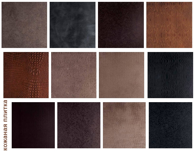 Moderne Hersteller von Fliesenmaterialien sind bereit, eine breite Palette von Lederfliesen anzubieten, die sich nicht nur in der Oberflächenstruktur und dem Muster unterscheiden, sondern auch in Form und Größe. Darüber hinaus sind viele Unternehmen bereit, auf der Lederoberfläche der Fliese ein beliebiges Muster oder Muster auf Bestellung auszuführen.