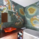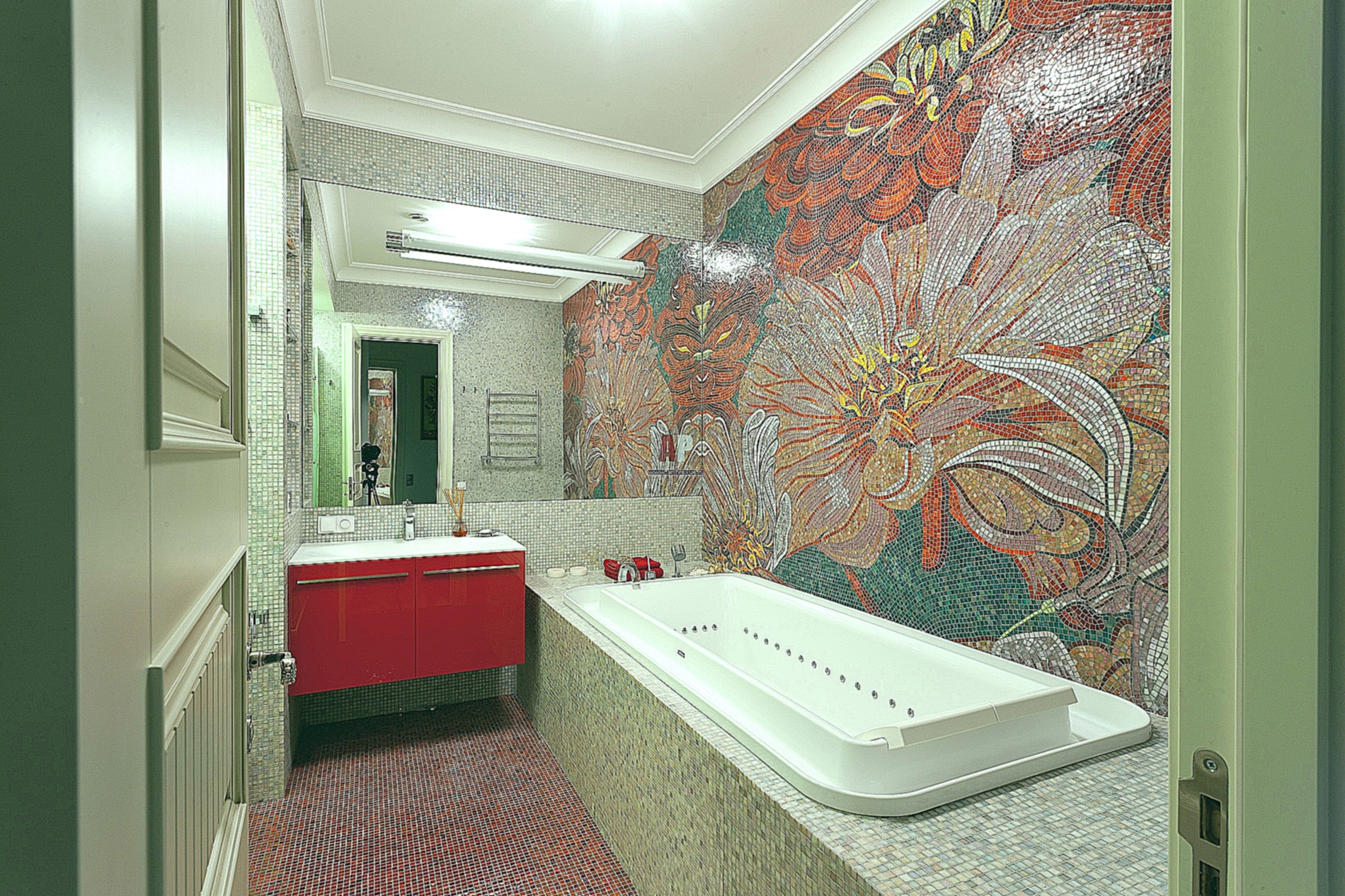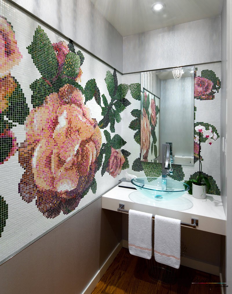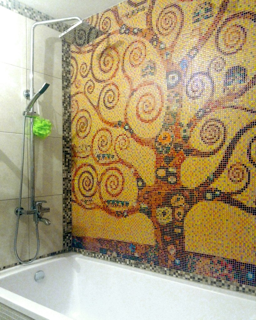 - Es ist zulässig, Originalplatten, Dehnungsstreifen und Muster, z. B. an Wänden, aus Teilen unter einem Mosaik anzuordnen. Dieses Detail wird das Interieur einzigartig und unvergesslich machen.
