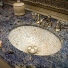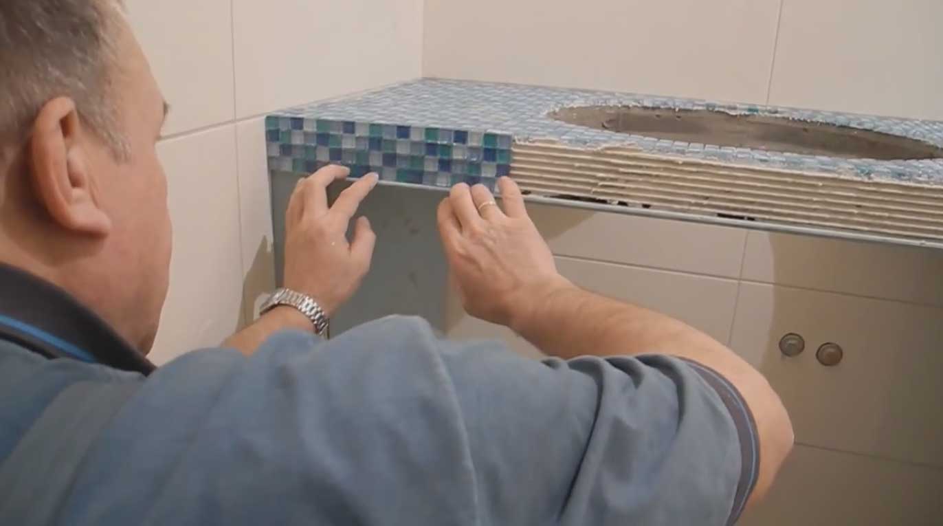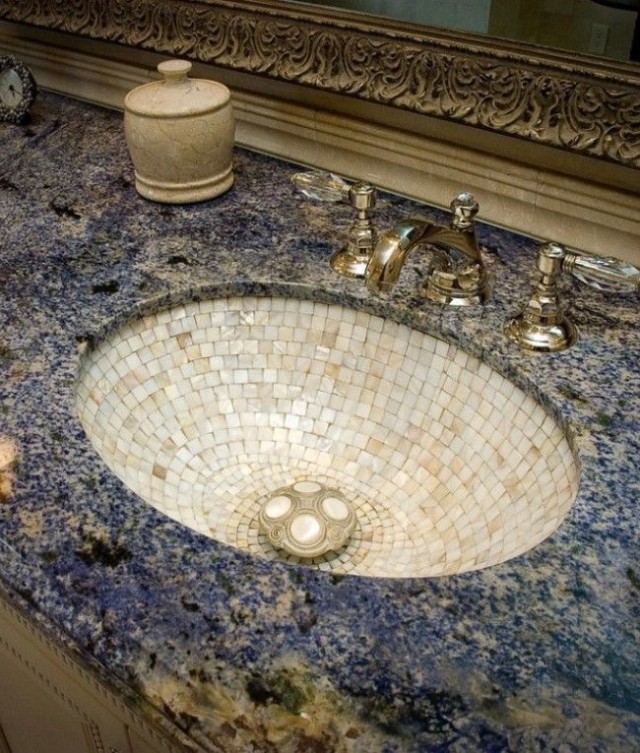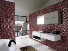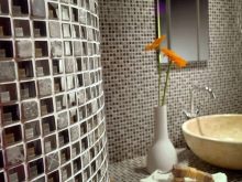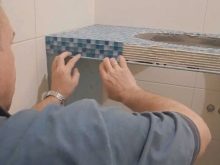 - Solche Materialien können nicht nur auf den Boden und die Wände gelegt werden. Bei der Gestaltung von Waschbecken, Arbeitsplatten, Duschkabinen und Bädern werden häufig Mosaikfliesen verwendet. So erhalten die üblichen Dinge ein wirklich erstaunliches Design.