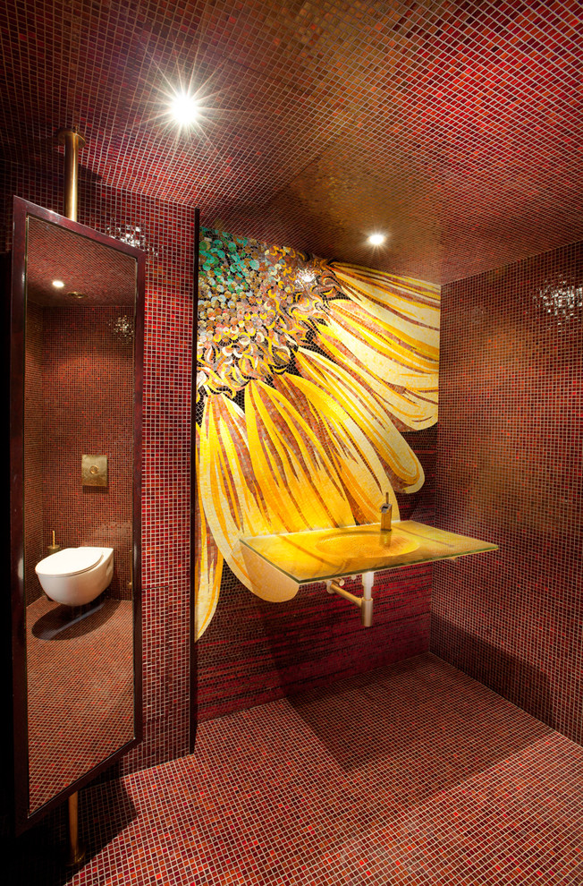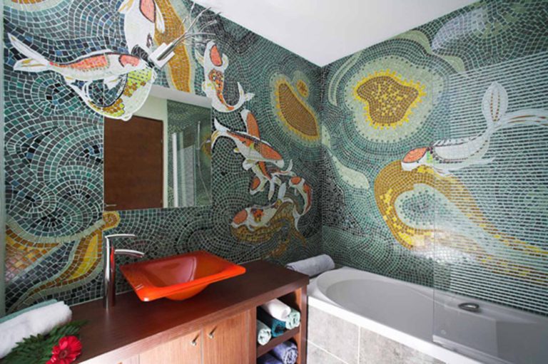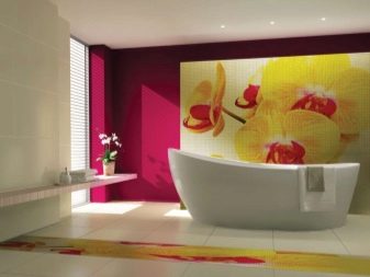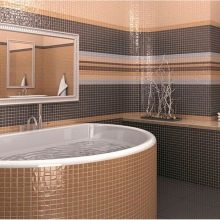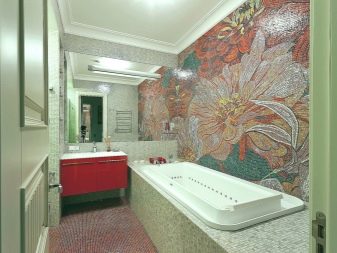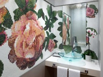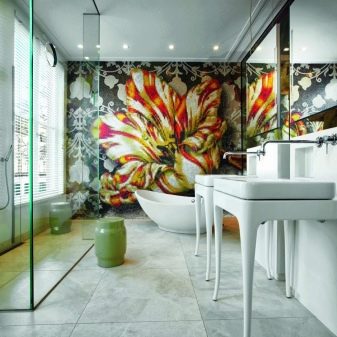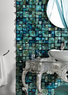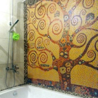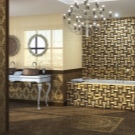 - Der Hauptvorteil der Mosaikfliese ist ihr reiches und vorzeigbares Design. Sie können sicher auf eine solche Dekoration anwenden, wenn Sie in das Innere des Badezimmers ein einzigartiges Highlight und lebendigere Farben bringen möchten.