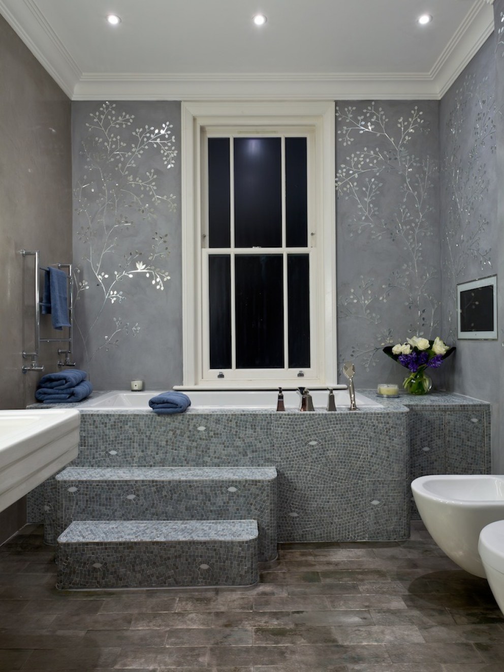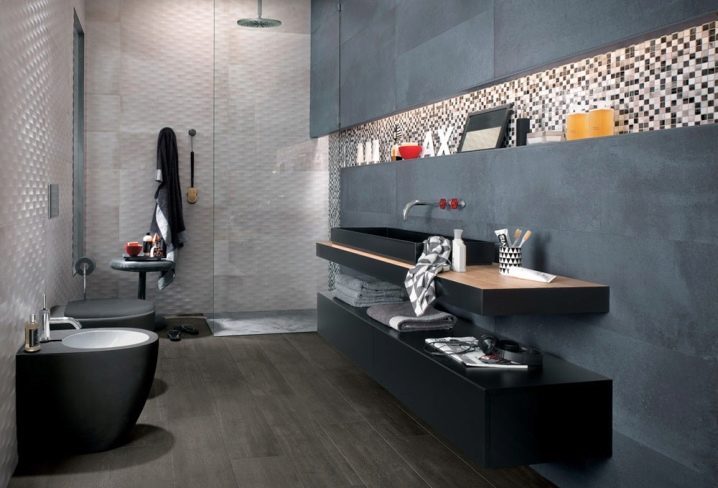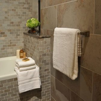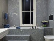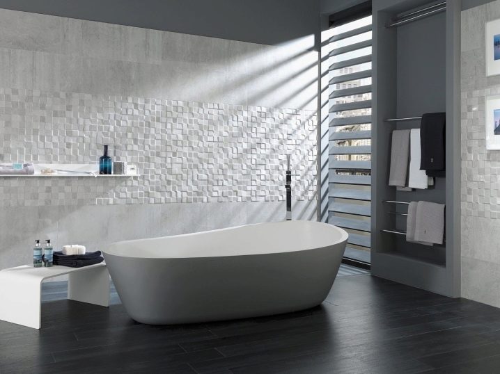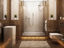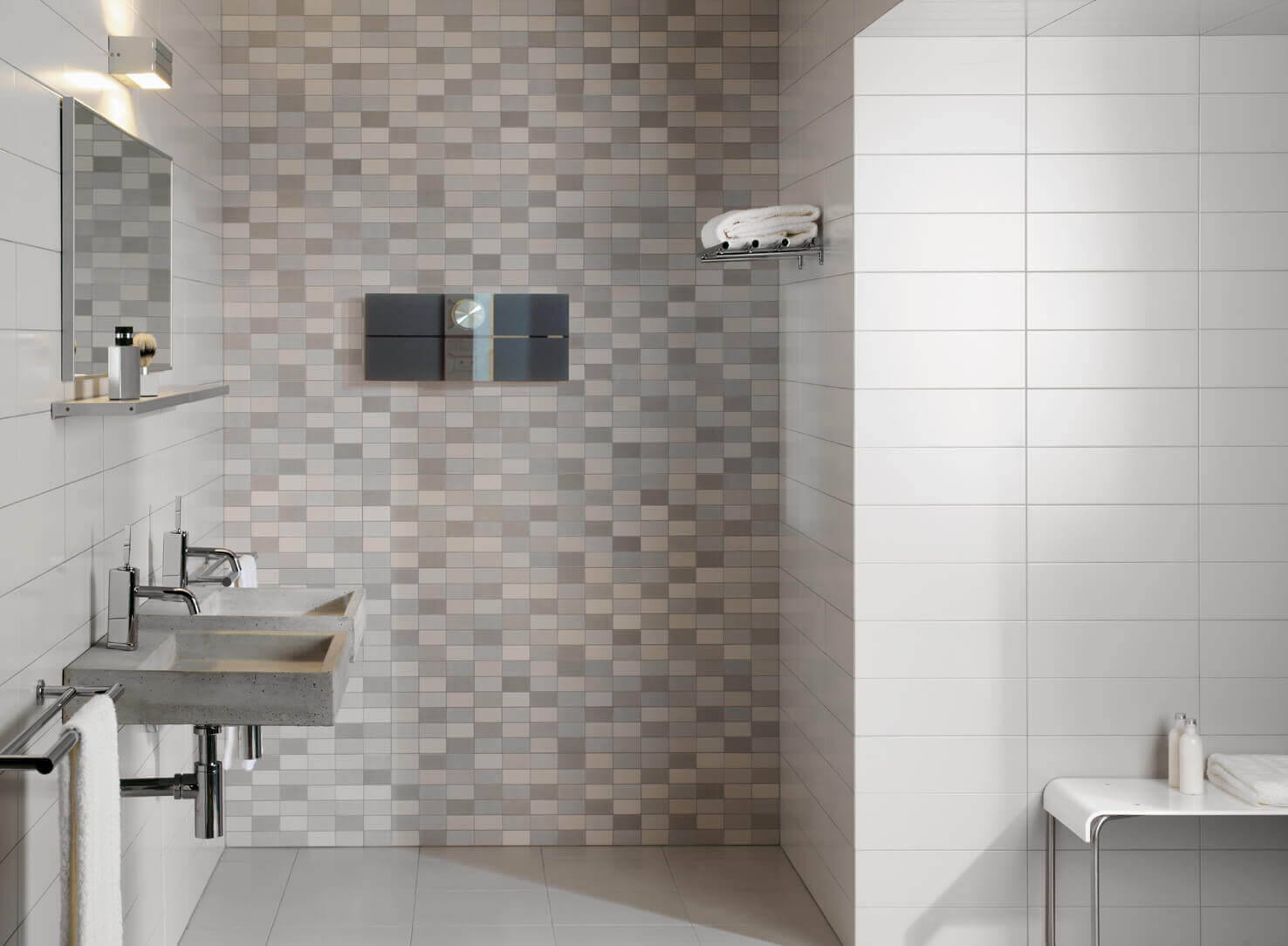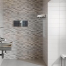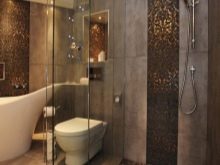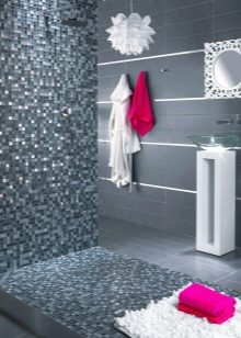Eine ähnliche Betonung kann im Badezimmer gemacht werden, das mit großen weichen grauen Fliesen verziert ist. In solch einem Raum sollte ein weiß-grau-braunes kleines Mosaik mit einer der hervorstehenden Wände beendet werden, zum Beispiel hinter der Toilette.