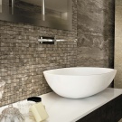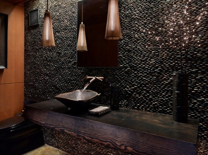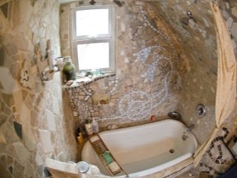 Steinfliesenmosaik sieht teuer, stilvoll und aristokratisch aus. Diese Verkleidung besteht aus allen möglichen Steinen. Es kann sogar schicker Marmor oder Hochleistungsgranit sein. Oft treffen sich im Laden helle Produkte aus Jaspis oder Schiefer.Die Fliese aus ähnlichen Rohstoffen kann zur wirklichen Dekoration des Badezimmers werden, in jeder stilistischen Richtung ausgeführt.