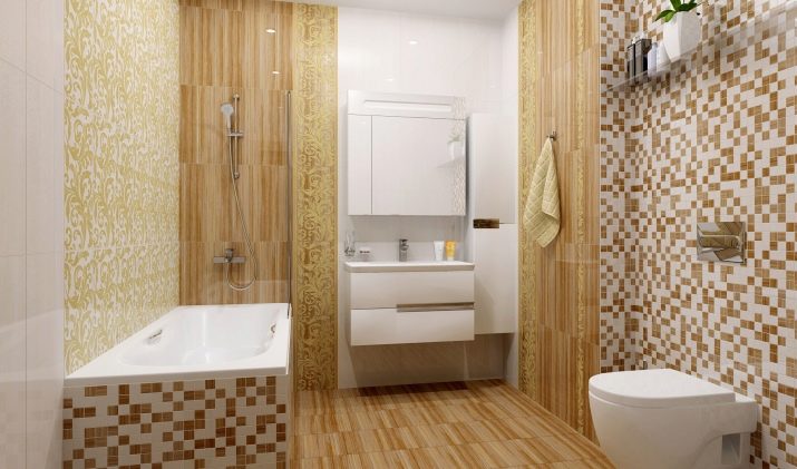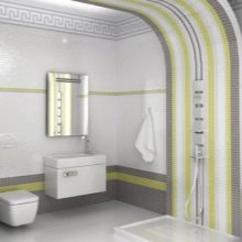 Manchmal macht ein Mosaik separate Einsätze an den Wänden. Vor dem Hintergrund eines gekachelten monochromen Finish sehen solche Elemente viel interessanter aus, verdünnen das frische Bild des Raumes und geben ihm ein vollständiges Aussehen.