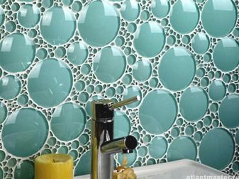 Die zweitbeliebteste ist ein Glasmosaik-Finish. Solche Produkte sind billiger als Keramik und haben die gleichen technischen Eigenschaften wie gewöhnliches Glas. Es gibt jedoch einen wichtigen Unterschied - Glasfliesen sind haltbarer und zuverlässiger.