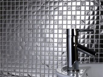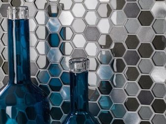 Metallfliesen für Mosaik, die von modernen Herstellern angeboten werden, unterscheiden sich nicht nur in Farbton und Größe, sondern auch in der Form. Auf der Suche nach originellen Optionen finden Sie beispielsweise schöne Fliesen in Form von sauberen Dreiecken oder vielflächigen Sechsecken.