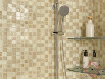 - Hochwertige Fliesen unter dem Mosaik haben keine Angst vor erhöhter Feuchtigkeit und Feuchtigkeit, vor der Sie sich in den Badezimmern nicht verstecken können. Unter solchen Bedingungen versagt ein solches Finish nicht, reißt nicht und verformt sich nicht.