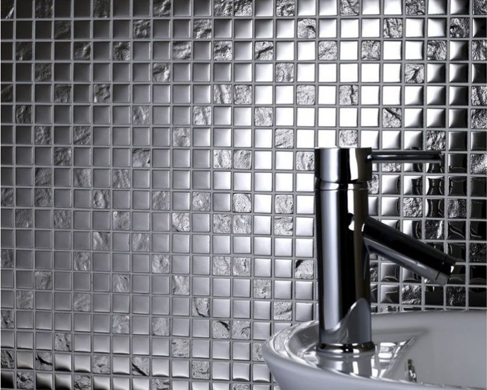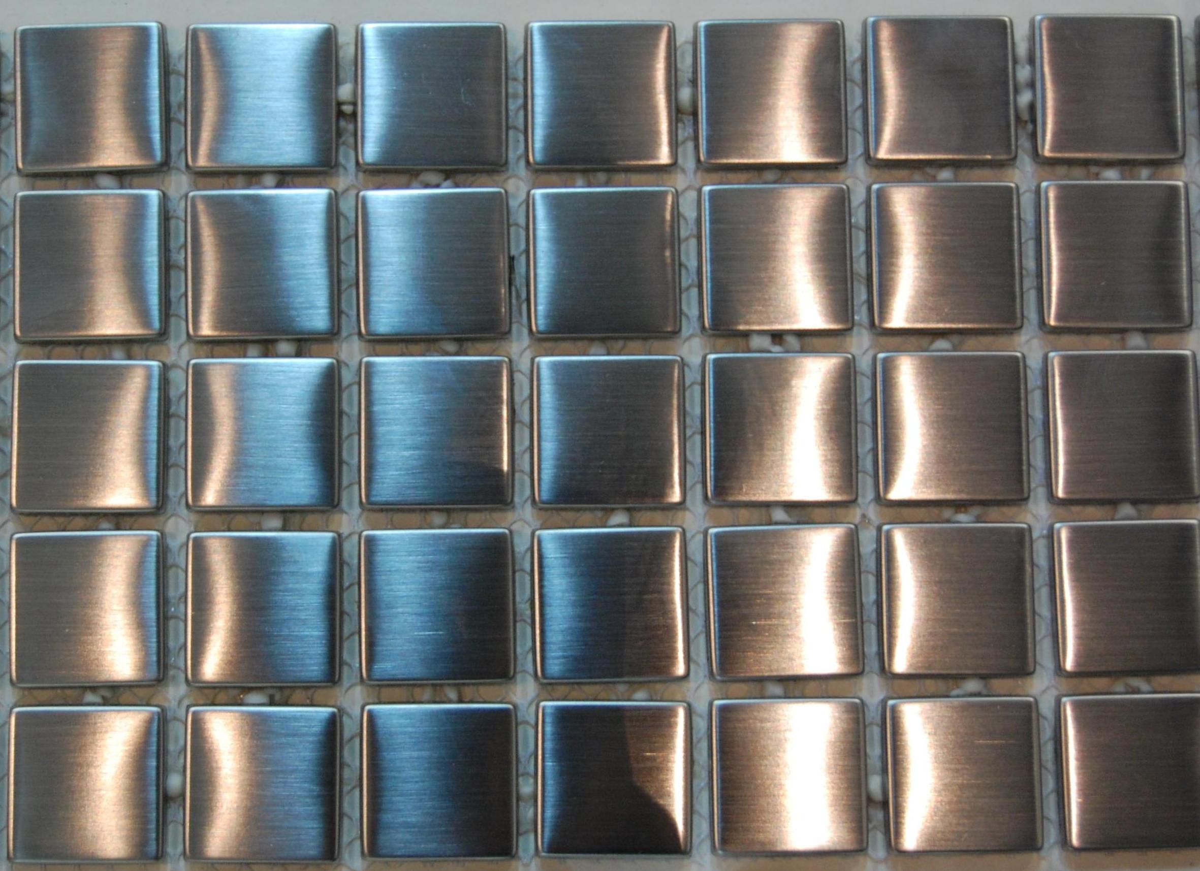 Solche Beschichtungen werden aus verschiedenen Arten von Metallen hergestellt. In Geschäften häufiger als andere Optionen gibt es Stahlsorten von Mosaikfliesen.Ungewöhnliche Messingproben gelten als die zweitbeliebtesten.