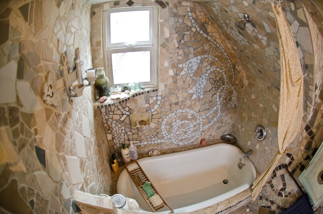- Gut verlegte Mosaikfliesen können einige Mängel der Wände verbergen. Natürlich, wenn wir nicht über zu viel Schaden an der Decke sprechen.