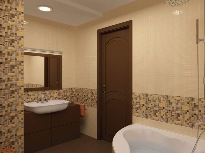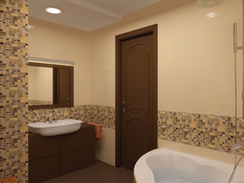 Wenn Sie zurückhaltende Töne mögen, können Sie die Wände im Badezimmer mit sandigen Farbtönen dekorieren. Zum Beispiel kann der obere Teil des Bodens eine monochromatische Creme Schatten, sowie die untere sein, und die Mitte sollte mit quadratischen Fliesen mit Sand, braunen und schwarzen Flecken ausgelegt werden.Vor dem Hintergrund eines solchen Finishs werden Schokoladensockel und Holztüren sowie einfache weiße Rohrleitungen harmonisch aussehen.