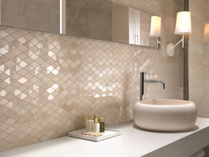 Eine rautenförmige, glänzende Mosaikfliese in hellen Farbtönen ist perfekt für exquisite und elegante Innenräume. Sie kann eine Wand an der Pastellschale (nahe oder hinter) auslegen. Das Tandem sollte mit einfachen Wandleuchten mit länglichen gewebten Gelbschattierungen und einem unauffälligen rechteckigen Spiegel über der Spüle vervollständigt werden.