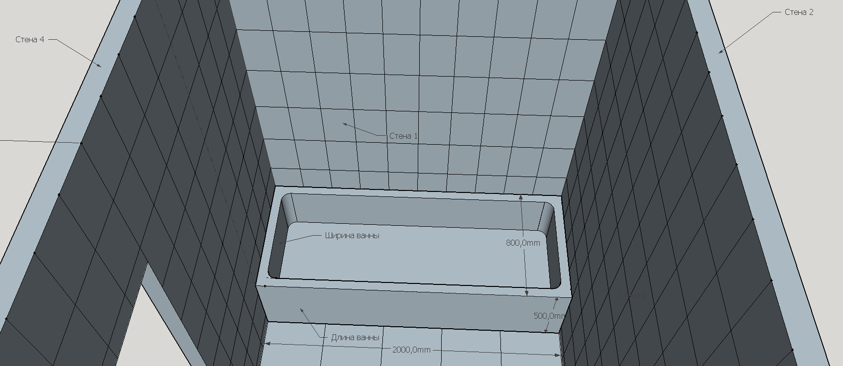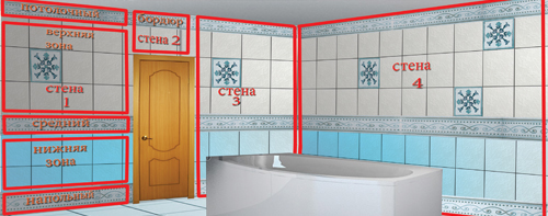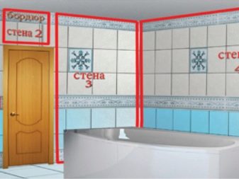Wenn ein Badezimmer mit einem Bordsteineinsatz oder Fliesen unterschiedlicher Größe und Materialien im Badezimmer verwendet wird, wird die Berechnung nicht auf einfache Weise funktionieren. Zu Beginn ist es auch notwendig, das Quadrat der Wände und des Bodens minus der Fläche von Fenstern und Türen zu berechnen. Dann brauchen Sie alle Elemente, abwechselnd Reihen von unten nach oben, setzen Sie eine gerade Säule auf die gesamte Höhe des Zielbereichs.