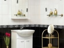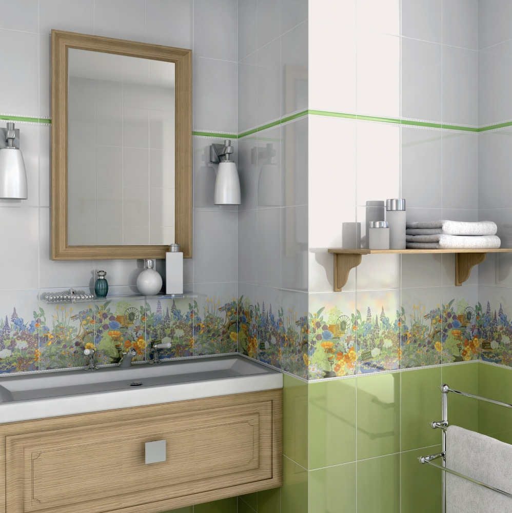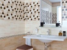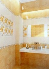 - Im Badezimmer zur Wandfliesengröße von 20 x 30 cm können Sie eine Serienbodenfliese in einem Farbton hinzufügen. Dies ist der einzige Ort im Haus, an dem die Fülle dieses Materials angemessen erscheint. In der Regel hat das Serienmaterial Akzente, die die Bildkomposition nicht überladen.