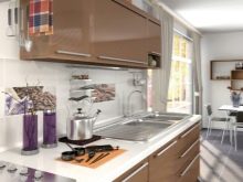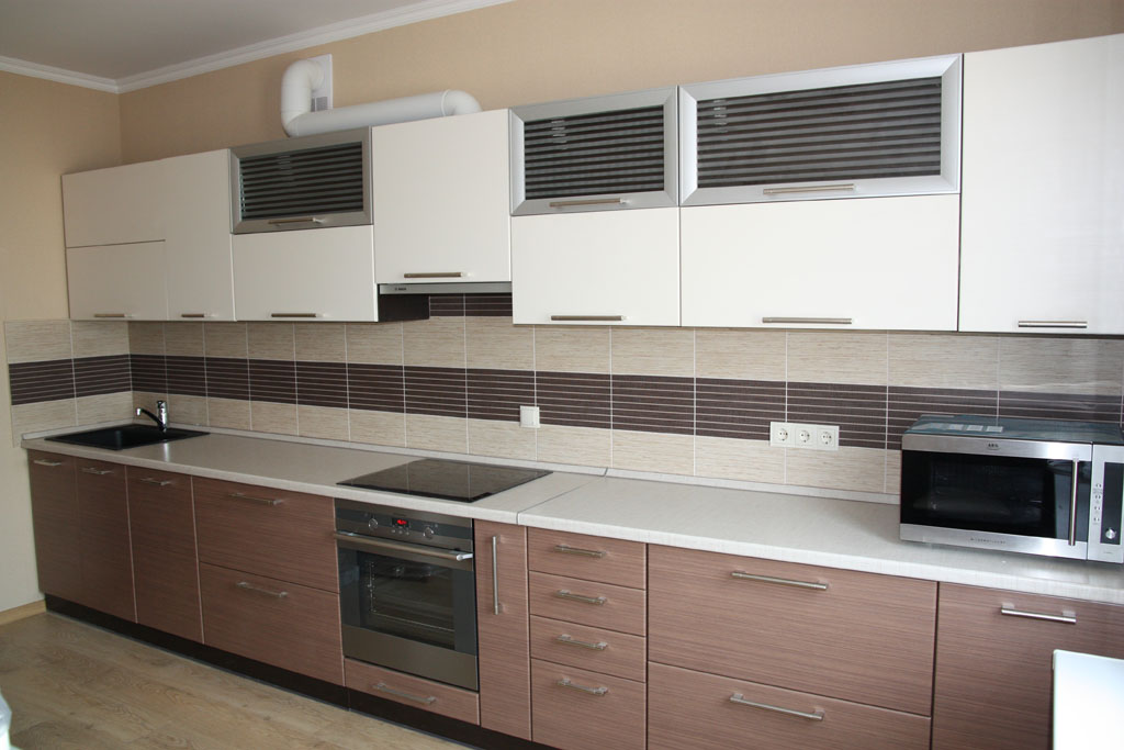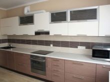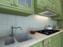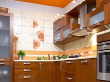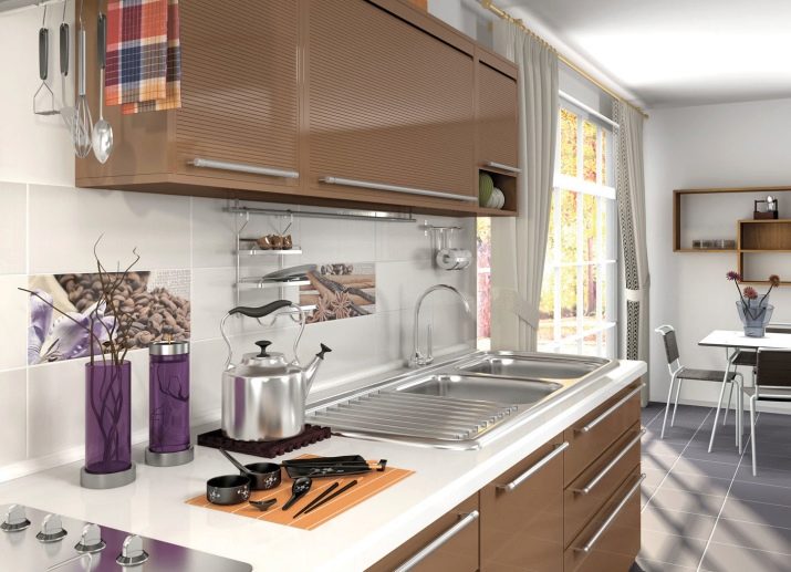 - In der Küche mit solchem Material können Sie eine "Schürze" auslegen, indem Sie kontrastierende Fragmente von Küchen- oder geometrischen Themen in das Futter einfügen.