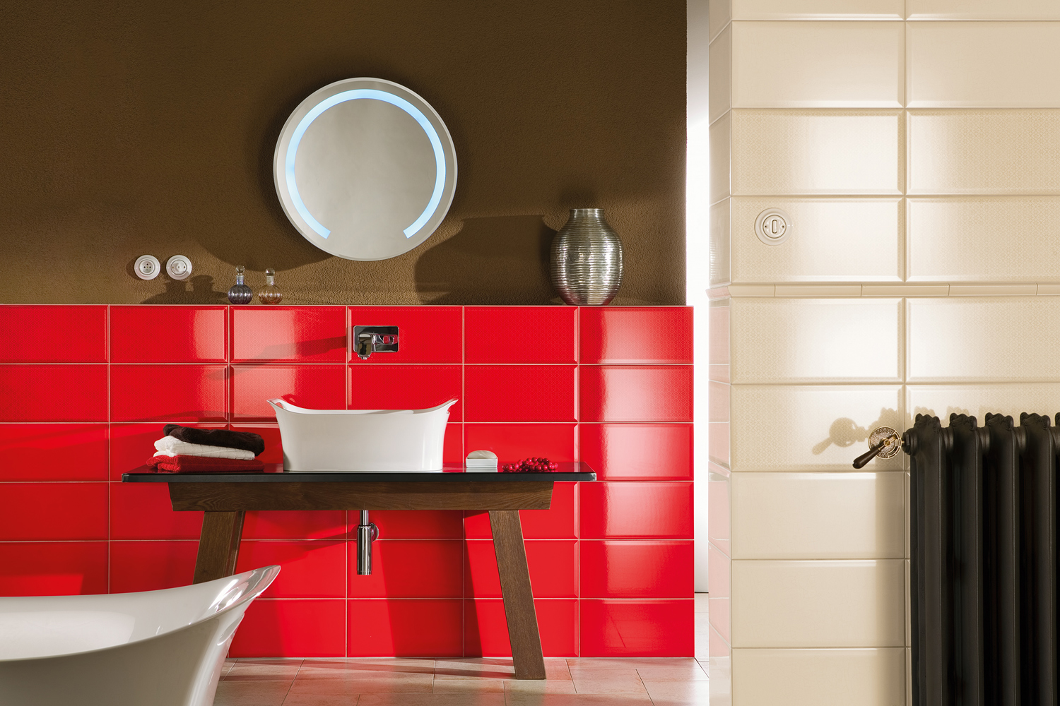 - Verwenden Sie keine hellen Fliesenwenn die Möbel in satten Farben hergestellt werden.