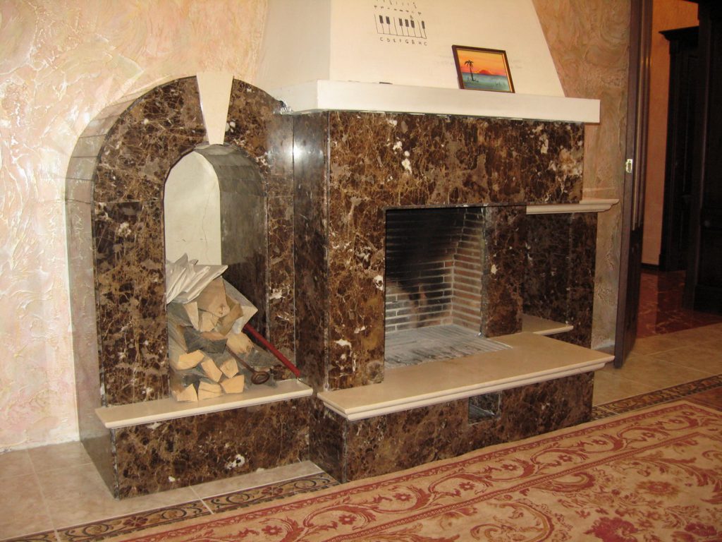 - Im Wohnzimmer oder in der Küche können Wandfliesen den Kaminvorsprung verzieren, indem sie ihre Farbe in dem gleichen Farbschema wählen wie der Ton der Innenkomposition.