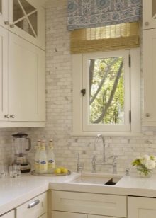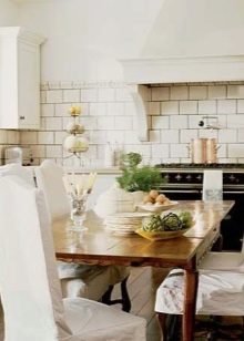 Die Küche verwendet Fliesen mit einem verblichenen Muster, helle Farben machen den Raum optisch breiter. Meistens wird es verwendet, um eine Schürze und einen Bodenbelag zu schaffen, aber manchmal deckt es die Wände ab.