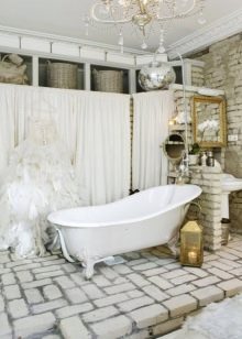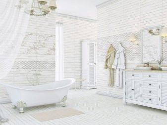 Für das Badezimmer ist Fliese ein vertrautes Material. Imprägniert mit antibakterieller Beschichtung, hält es Schimmelpilze nicht zurück, es ist leicht zu pflegen. Chebbi-Chic Badezimmer ist nicht für Fans von trendigen Trends konzipiert, es ist durchdrungen von warmen Farben, hat eine Gemütlichkeit und Romantik.