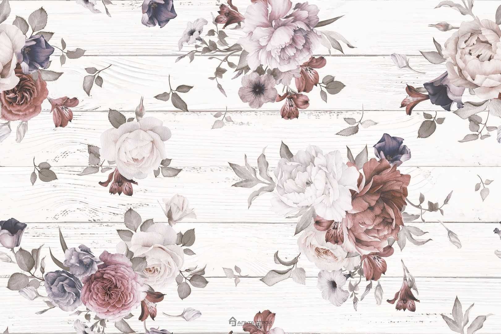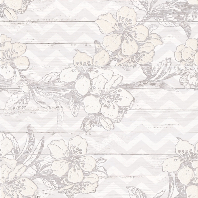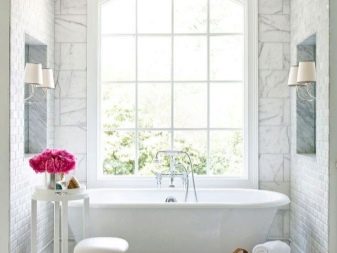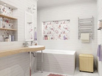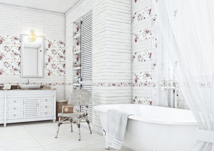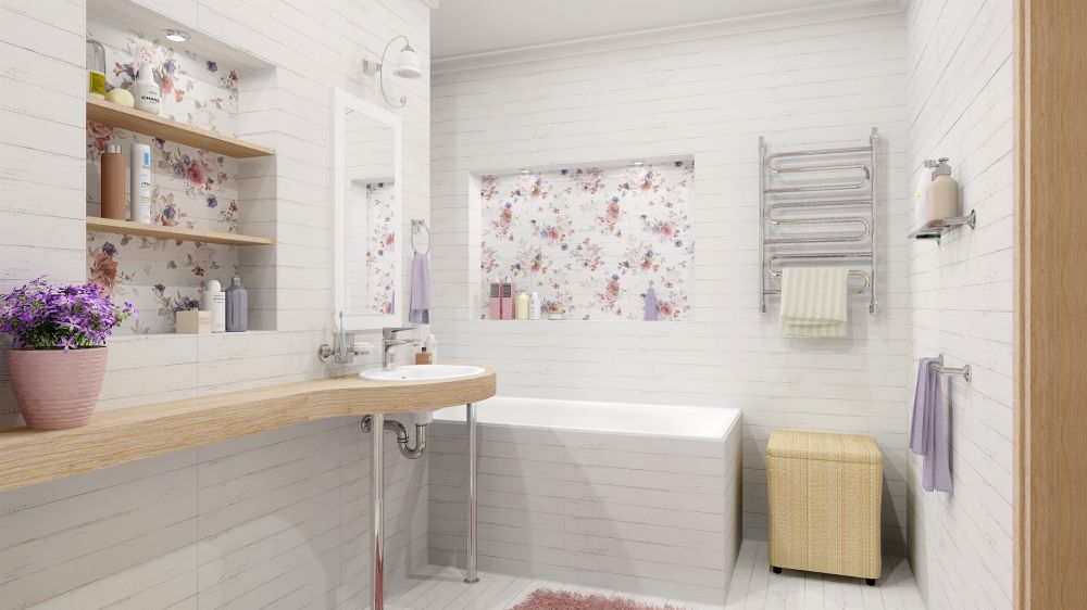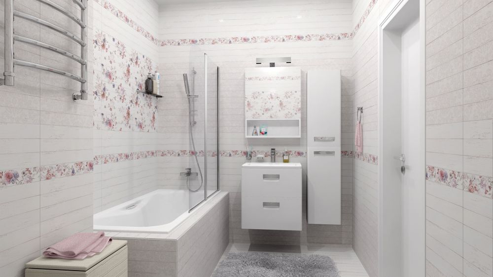 Das mit milchfarbener Keramik ausgekleidete Badezimmer wirkt hell und gemütlich. Der Innenraum mit hohen Wänden könnte in einem monotonen weißen Farbton aufgelöst werden, wenn nicht ein zartes Blumendekor eingefügt wäre.